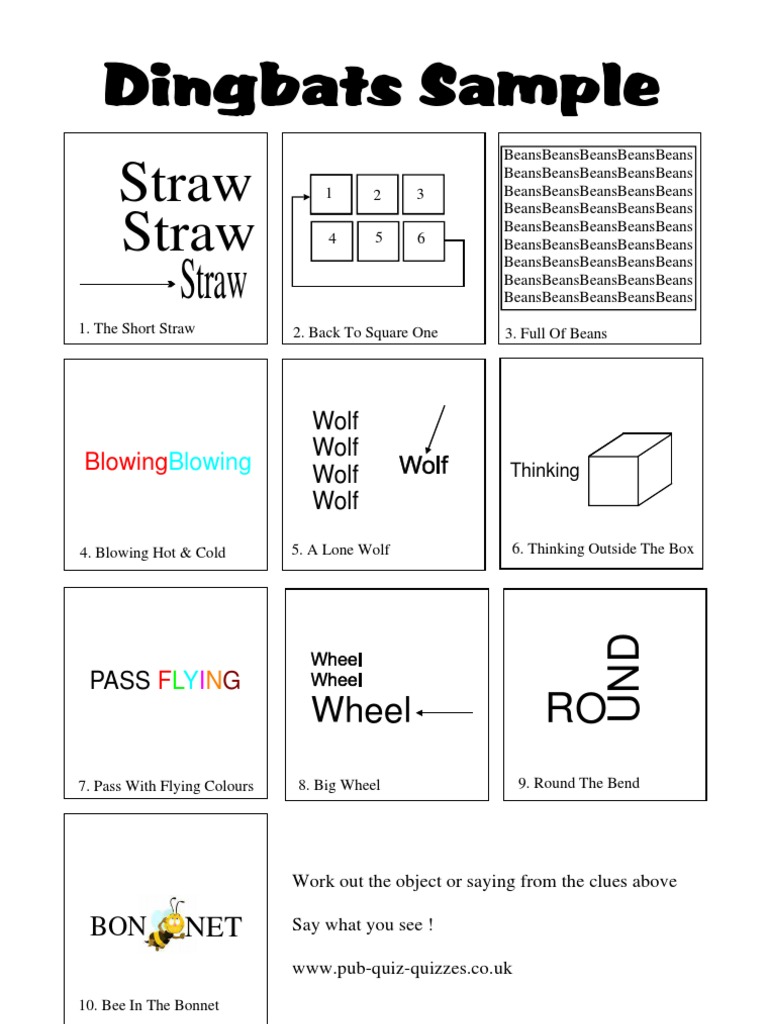 We are sharing with you today the answers for the game dingbats developed by peter rutherford. Each sheet contains twenty different puzzles and are downloadable via the links below in. Give no quarter, three coins in a fountain, blast from the past, high five, a piece of cake, one foot in the grave, prime time, misunderstanding, seasides. ~ dingbats ~ colt beretta derringer head ton 4 arms legs surbmwance top gun wait for nobody car insurance e y e s see no evil eyes wide. Dingbats word trivia all levels 500+ answers in one page 1.